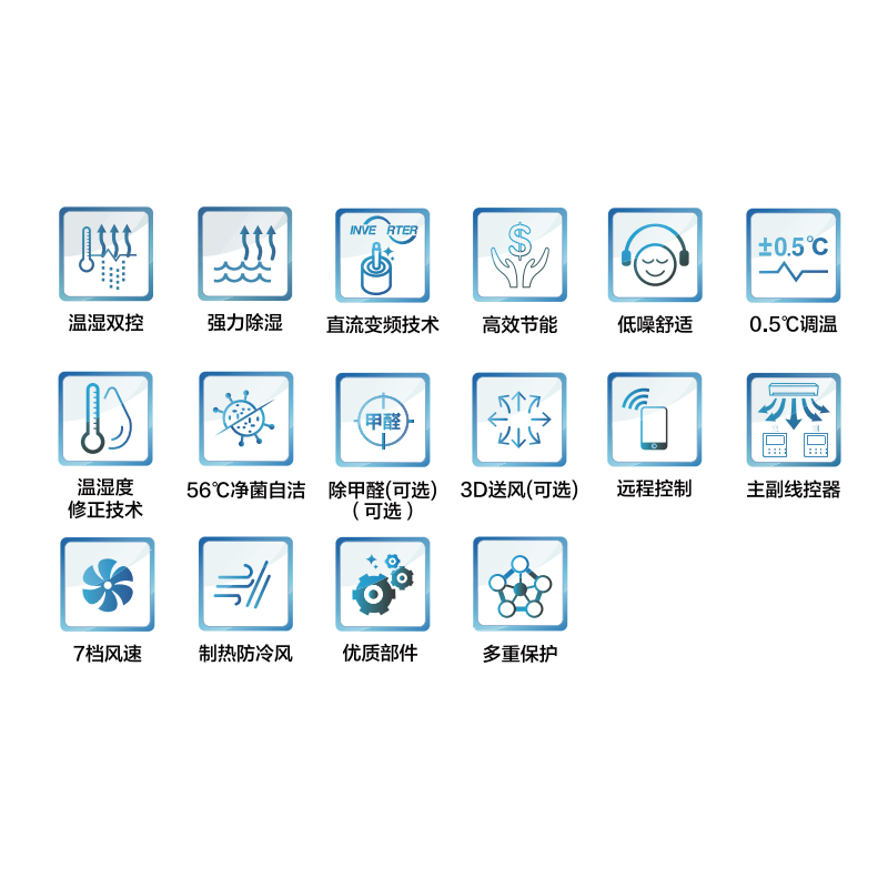 格力·睿风恒温除湿中央空调采用全直流变频技术,内机 7 档风速设置,搭配小巧袖珍型室内机设 计全面融入室内装潢,隐藏式安装,为不同空间创造出同样优雅和谐的舒适环境。 全新除湿模式功能设计,支持在环温 5 ~ 32℃下的除湿需求,高效舒适除湿。该系列拥有 3.5kW 和 7.2kW 两种冷量机型,可满足大 / 小空间除湿需求。 该系列采用创新引风通道设计,搭配高品质压缩机及控制系统,实现宽幅温度范围运行。55℃高温 环境下强劲制冷,-15℃超低温环境下强劲制热。
